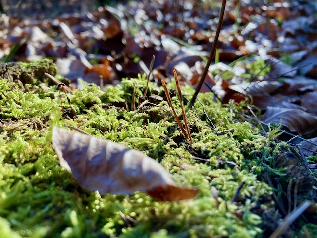 These small signs are, nonetheless, as artlessly beautiful as the last glow of the day reflected pinkly on the mountains, and just as shaped by the light. The low winter sun raking through the trees, picking out fallen leaves. Bracken, just catching the sun. Moss on a tree, backlit, appearing to glow from within.